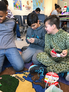 We also tried to see what will dissolve candy canes. We did this with both grades. We used water, oil, vinegar and rubbing alcohol. After I took them home, the rubbing alcohol and the vinegar have not yet finished dissolving the candy cane and the oil preserved them. We made predictions prior to placing them in. We will discuss what happened in the new year. Here are some pictures of the experiment.